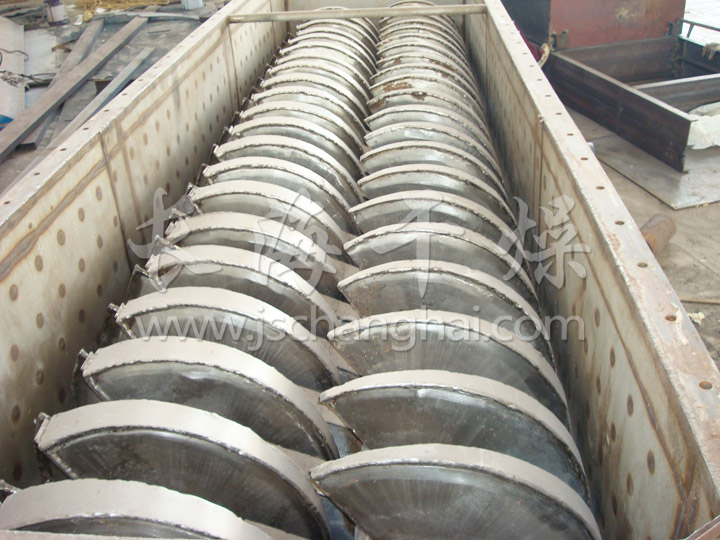 c.楔形槳葉具有自凈能力,可提高槳葉傳熱作用。旋轉(zhuǎn)槳葉的傾斜面和顆粒或粉末層的聯(lián)合運動所產(chǎn)生的分散力,使附著于加熱斜面上的污泥自動地清除,槳葉保持著高效的傳熱功能。另外,由于兩軸槳葉反向旋轉(zhuǎn),交替地分段壓縮(在兩軸槳葉面相距^近時)和膨脹(在兩軸槳葉面相距離^遠時)攪拌功能,傳熱均勻,提高了傳熱效果。